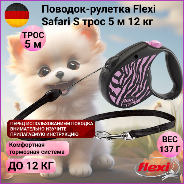 Поводок-рулетка Flexi Safari трос S 5м 12кг pink Zebra